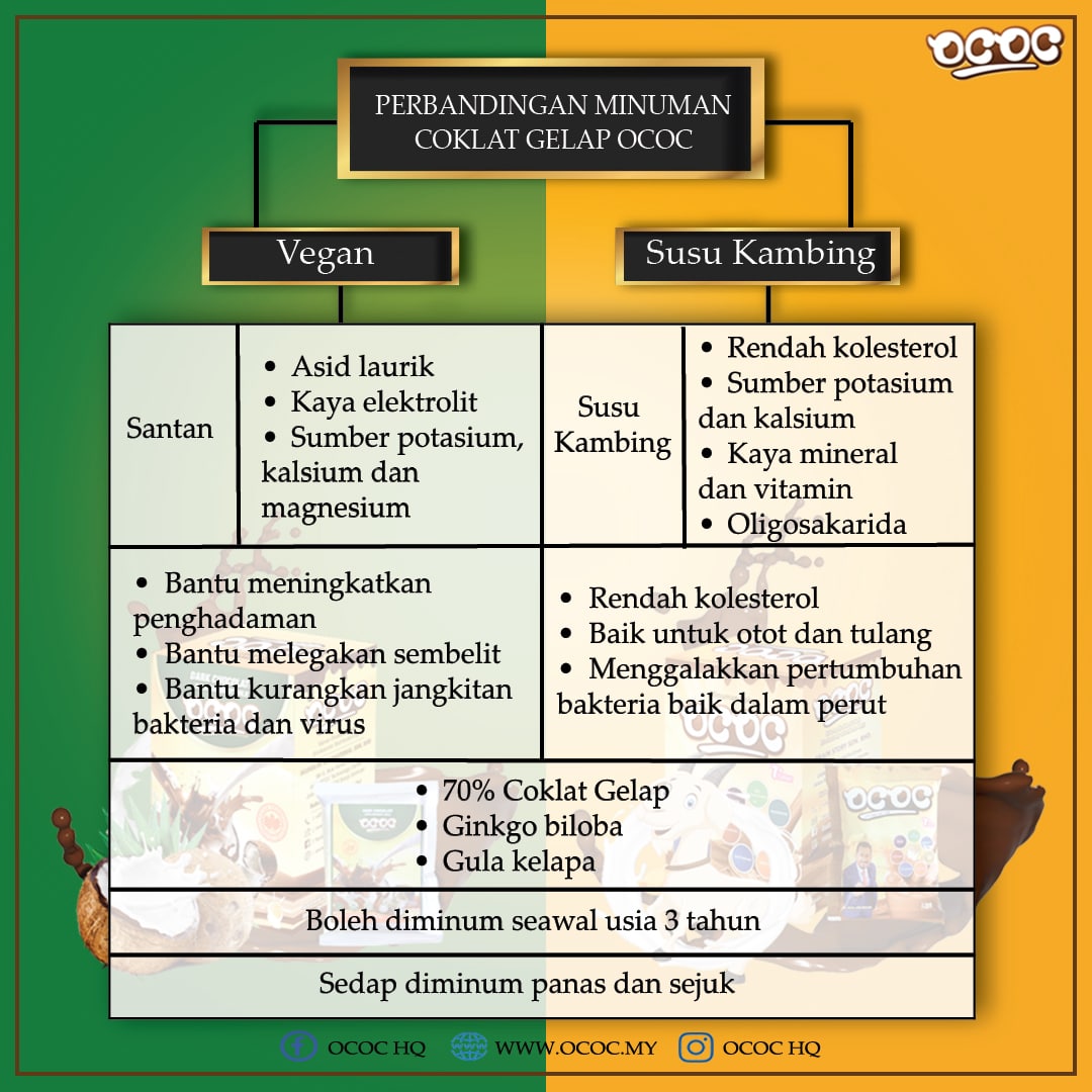OCOC Vegan Dark Chocolate Drink dengan Santan ialah minuman coklat tanpa tenusu pertama di Malaysia! Diformulasikan khas tanpa susu lembu dan laktosa, ia sangat sesuai untuk vegan atau mereka yang mempunyai perut sensitif dan alahan susu. Diperkaya dengan Santan, Gingko Biloba, dan gula kelapa, minuman ini bukan sahaja lazat tetapi juga membantu meningkatkan fokus dan kesihatan usus.